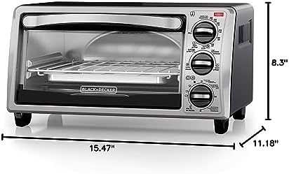Large enough for a 9” pizza or four slices of bread, the BLACK+DECKER 4-Slice Stainless Steel Toaster Oven with Broiler Pan complements any kitchen countertop. This compact, versatile toaster oven bakes, broils, toasts, and keeps food warm, at up to 450°F. It comes with a baking and broiler pan that fits perfectly into the small toaster oven interior. Plus, our exclusive EvenToast Technology optimizes heat distribution to toast bread evenly. When it’s time to eat, trust the #1 brand in toaster ovens*—BLACK+DECKER. Large viewing window keep an eye on food during cooking. The durable glass window gives you a clear view of food throughout the cooking process. Bake/broiler pan don’t worry about finding pans to fit in the oven. The included baking/broiling pan fits perfectly, making it easy to insert and remove food. Toasting rack also included.