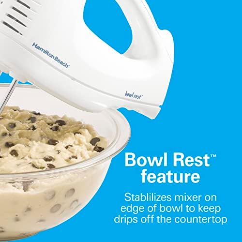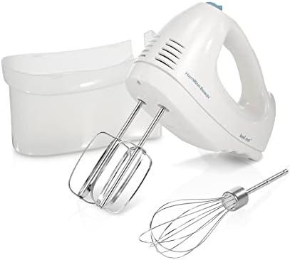 Whip up an airy meringue or decadent cake with the Hamilton Beach hand mixer. This versatile mixer is your go-to appliance for mixing, whisking, and folding with 250W of peak power. A built-in bowl rest makes it easier to set the mixer down when adding ingredients. The mixer has six speeds, including quick burst functions for additional power at any speed. The Hamilton Beach hand mixer is not just about performance, it’s also designed for easy storage. A convenient snap-on case keeps attachments together, so you don’t have to search for them each time you need them. Includes traditional beaters and whisk.Snap-On Storage Case No more digging through the drawers to find your mixer attachments. A storage case perfectly fits all the attachments and cord. It then snaps onto the mixer, keeping everything together in one place.Snap-On Storage Case: No more digging through the drawers to find your mixer attachments. A storage case perfectly fits all the attachments and cord. It then snaps onto the mixer, keeping everything together in one place.