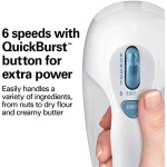 6 speeds with QuickBurst button. This versatile hand mixer has 6 different speed options, plus a QuickBurst button for an extra burst of power when you need it. It easily handles a variety of ingredient, from nuts to dry flour and creamy butter. Rest stabilizer Six speeds with Quick