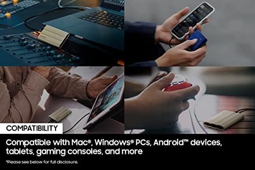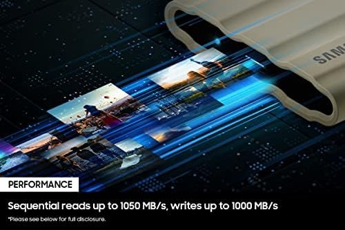 Samsung T7 Shield Portable SSD delivers high performance on-the-go, not matter the terrain. It has an IP65 rating for water** and dust* resistance, with Dynamic Thermal Guard to manage heat control. Transfer huge files instantly. USB 3.2 Gen 2 and PCIe® NVMe™ achieve soaring sequential read/write speeds of up to 1,050/1,000 MB/s***, allowing you to edit directly from the drive. The rugged design and advanced outer elastomer add extra durability to even endure a 9.8 foot drop****. The T7 Shield is compatible with PC, Mac, Android devices, gaming consoles, and more*****. Included in the box are USB Type C-to-C and Type C-to-A cables****** for added convenience. Comes with a 3 Year warranty.*Consistent with IP65 rating, tested under controlled conditions: 2kg/m3 of active dust with a pressure under 2kPa for 8 hours. Dust resistant capabilities may vary depending on the actual conditions. **Consistent with IP65 rating, tested under controlled conditions: water flow of 100kPa for 3 minutes. Water resistant capabilities may vary depending on the actual conditions. ***Performance may vary depending on host configuration. To reach maximum read/write speeds of up to 1,050/1,000 MB/s, respectively, the host device and connection cables must support USB 3.2 Gen 2 and the UASP mode must be enabled. Test system configuration: ASUS Z270 ROG MAXIMUS IX HERO (USB 3.2 Gen2 Type-C), Intel(R) Core(TM) i7-7700K CPU @ 4.20GHz, OS- Windows 10 19H2. ****Tested to withstand 9.8-ft (3 meters) drop under controlled conditions. Drop resistance capability may vary depending on the actual environmental conditions. *****Compatibility with host devices may vary. Some operating systems may require T7 Shield reformatting. ******T7 Shield is compatible with USB 3.0 and USB 2.0. *******Source: 2003~2021 OMDIA data: NAND suppliers’ revenue market share.
